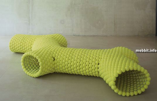 Голландский дизайнер Тейо Реми нашел весьма необычное применение теннисным мячикам, создав из них вот такие…скамейки :) Свою идею он продал Роттердамскому музею Boijmans Van Beuningen, посетители которого теперь имеют возможность передохнуть на таких оригинальных скамейках. А что, с учетом того, что теннисные мячики не очень твердые и довольно приятные на ощупь, сидеть на них должно быть тоже достаточно удобно.