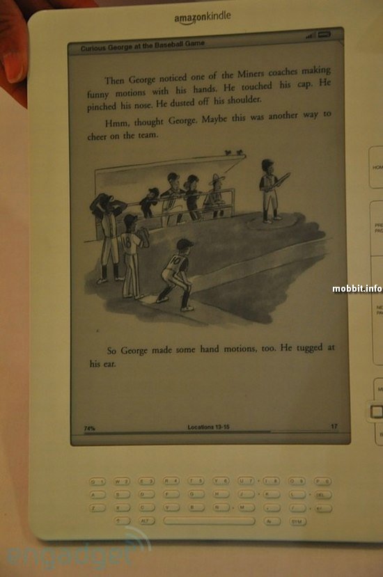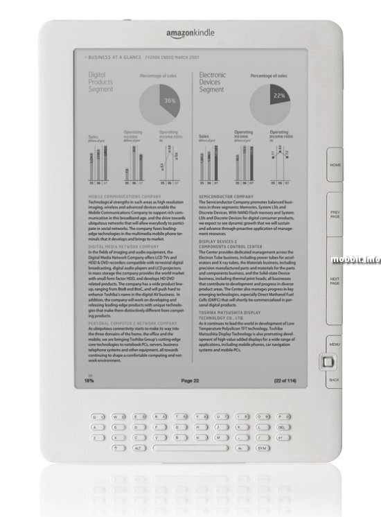 Вчера компанией Amazon был представлен e-reader Kindle нового, уже 3-го поколения - Kindle DX. В нем довольно много новшеств по сравнению с предыдущей версией, главное из которых – большой 9,7-дюймовый E-Ink дисплей (разрешение 1200 x 824, 16 оттенков серого), увеличенная до 4 Гб память, чего хватит примерно на 3,5 тыс. книг, увеличенная длительность работы батареи (на одной подзарядке девайс проработает от четырех дней до двух недель, в зависимости от интенсивности использования), поддержка PDF (помимо TXT, HTML, DOC, RTF, JPEG, GIF, PNG, BMP, AAX, MP3), автоматический переход из портретного режима в ландшафтный, возможность регулировки длины строк. Присутствует поддержка EVDO, 3G, а навигационные клавиши перенесены в правую часть устройства. Само собой разумеется, что читать с помощью него можно не только книги, но и газеты, журналы, блоги и др. Все это, конечно, хорошо, и вещь получилась действительно хорошая, но цена... Цена несколько смущает – 489 долларов.
