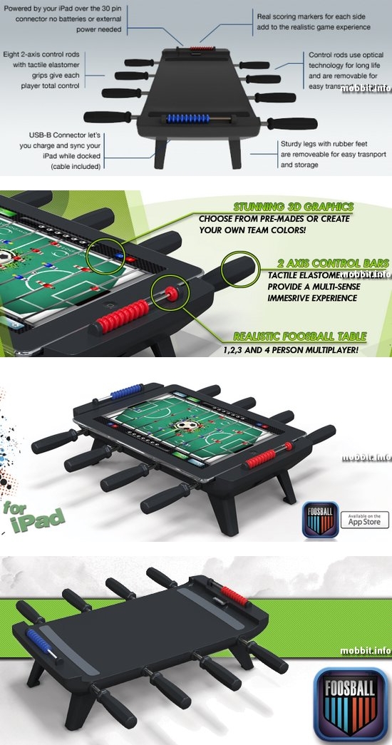 На рынке появился очень любопытный аксессуар для iPad – док-станция, позволяющая играть с помощью планшета в настольный футбол. Станция Classic Match Foosball выглядит как миниатюрный столик, оснащенный восемью ручками. Роль поля играет iPad с запущенным на нем специальным приложением (кстати, программа даже издает знакомые многим звуки, например, когда виртуальный футболист бьет по мячу). Пока идет сражение, планшет заряжается. Однако нужно учитывать, что Classic Match Foosball оборудована 30-пиновым коннектором (и места для переходника здесь нет), так что владельцы новейшей версии планшета курят в сторонке. Новинка обойдется в 100 долларов.